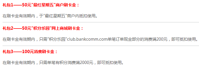 2、2014年1月1日至6月30日(暨新卡核发时间),,核卡日起45天(含)内于"最红星期五"商户或交通银行信用卡"积分乐园"网上商城单笔消费满100元,可获赠总计价值为200元的刷卡金礼包。礼包包括: